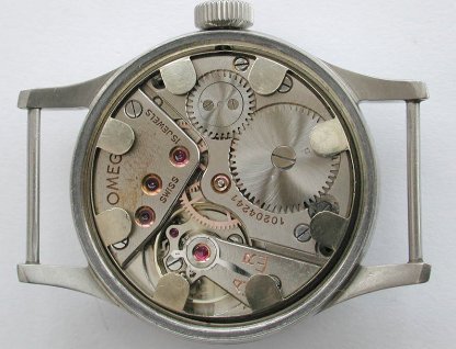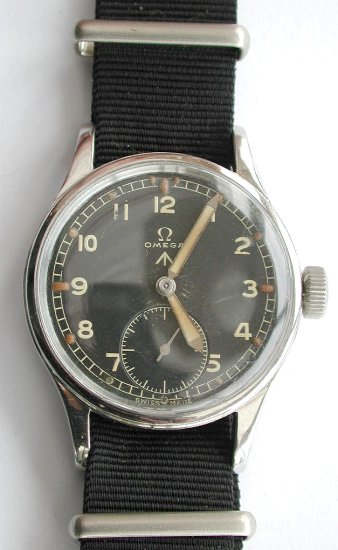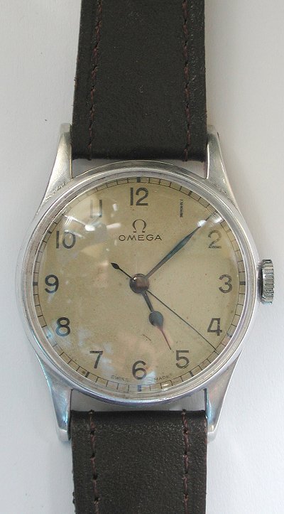 Gents stainless steel military issue hand wound Omega wristwatch.  The watch consisting of original untouched un restored black dial (this is a rare example which hasn't had the dial restored), with subsidiary seconds dial at 6 o'clock.  Luminous hands. Kings arrow (signifying English military issue) below Omega signature.  Screw on case back marked WWW (issued between 1943-58), also marked with the kings arrow, indicating that this has been issued to the British Army, and the individual military numbers.  Circa 1945.