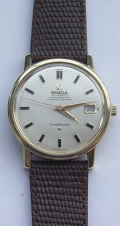 Classic 1968 Omega Constellation Automatic Date gold capped stainless steel automatic wristwatch. The watch with silvered dial  with aperture for date, the dial on this watch is original not restored and is in good condition for its age with a few minor imperfections visible on the larger picture of the watch, but hardly visible to the naked eye, self-winding 24 jewel movement adjusted to 5 positions and temperatures,steel screw back case with inset gold observatory logo in center of case back. The movement in this particular model of the Omega Constellation was considered to be one of the finest movements in production in it's day. A super quality classic wristwatch